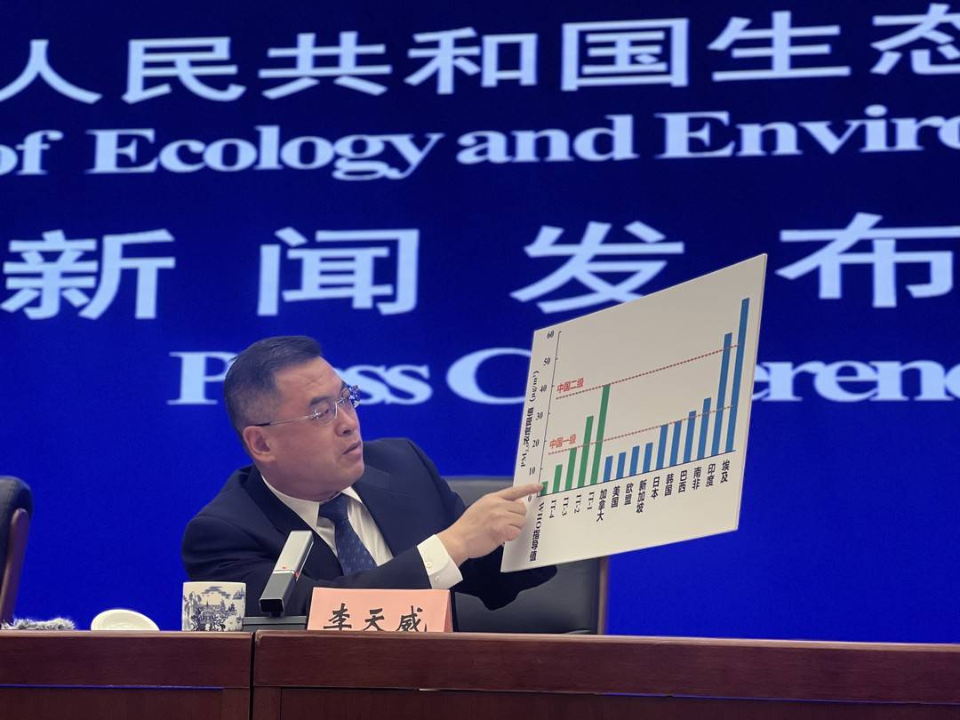 今年3月,生态环境部大气环境司司长李天威在发布会上回答封面新闻记者提问时介绍我国空气质量标准与国际标准差异。封面新闻记者 代睿 摄影