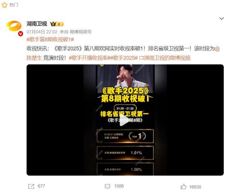 我们可以发现,在每期节目中,陈楚生都努力尝试新的风格,而演唱的每首歌曲都成功出圈,成为各地文旅最爱的歌曲之一,无论陈楚生是第一个演唱,还是最后一个演唱,只要他演唱,同时段的收视率都是最高的,本期直接突破1,《歌手2025》忍不住发出消息庆祝。