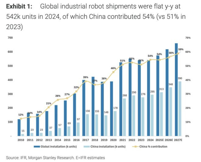 除了作为消费市场的重要性,中国在机器人生产和本土品牌建设方面也取得了显著进展。据大摩估算,目前全球约55%的机器人在技术上于中国生产,显示了其在全球机器人供应链中的制造核心地位。
