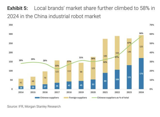 与此同时,中国本土机器人制造商的市场份额正急剧攀升。据追风交易台消息,摩根士丹利分析师ShengZhong、ChelseaWang等在近日发布的报告中表示,2024年,中国国产品牌在该国工业机器人市场的份额从2023年的47%一举跃升至58%,标志着本土供应链的技术成熟和市场接受度达到了新的里程碑。