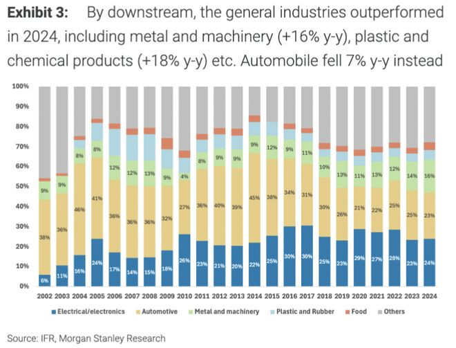 2024年,汽车和电子等传统应用领域的需求相对疲软。然而,以金属加工、机械、食品等为代表的“通用工业”领域需求持续上升,其安装量达到28.7万台,占全球总量的约53%。