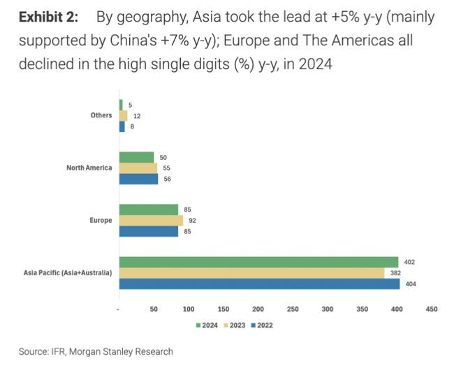根据国际机器人联合会(IFR)的数据,在中国的强劲表现(同比增长7%)带动下,包括澳大利亚在内的亚洲市场整体实现了5%的同比增长。相比之下,欧洲和美洲市场的安装量均出现了高个位数的同比下滑。