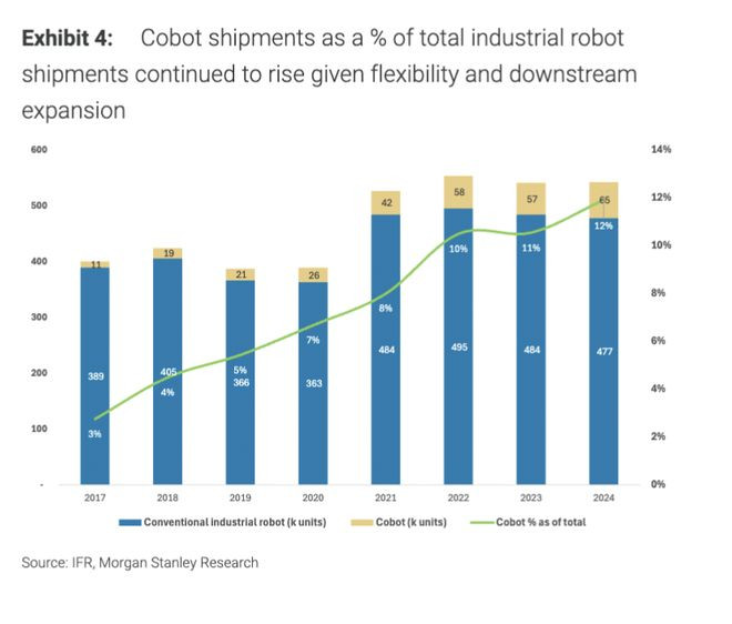 一是协作机器人,因其灵活性和易于部署的特点,2024年全球安装量同比增长12%,在工业机器人中的渗透率已上升至12%。